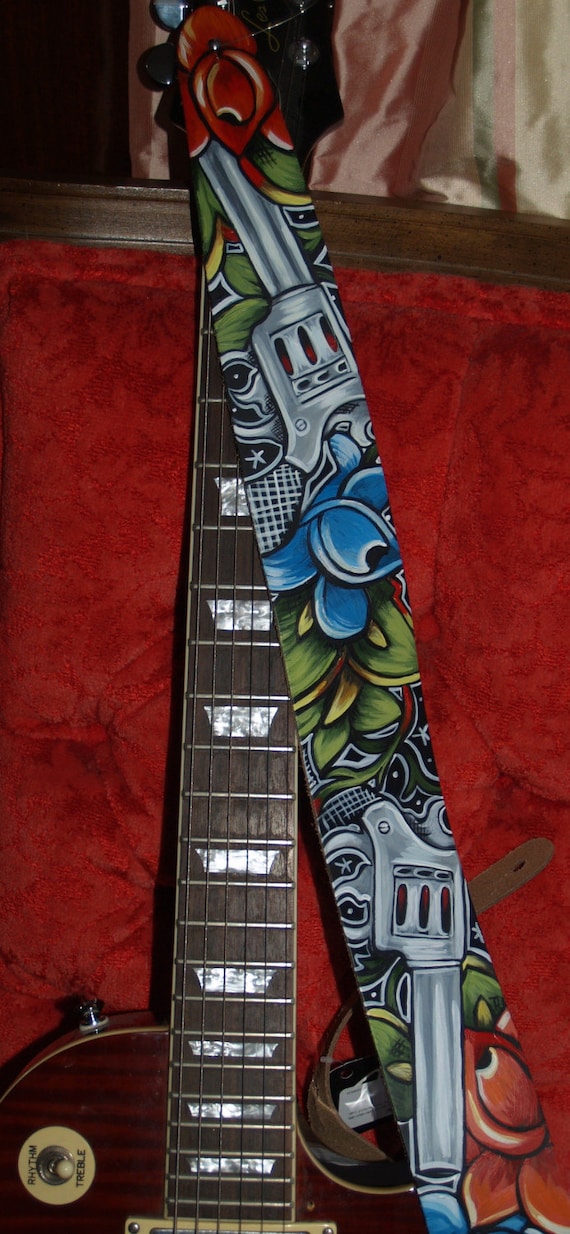 Tattoo Leather Guitar Strap Hand Painted Guns And Roses Rockin